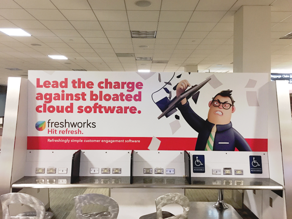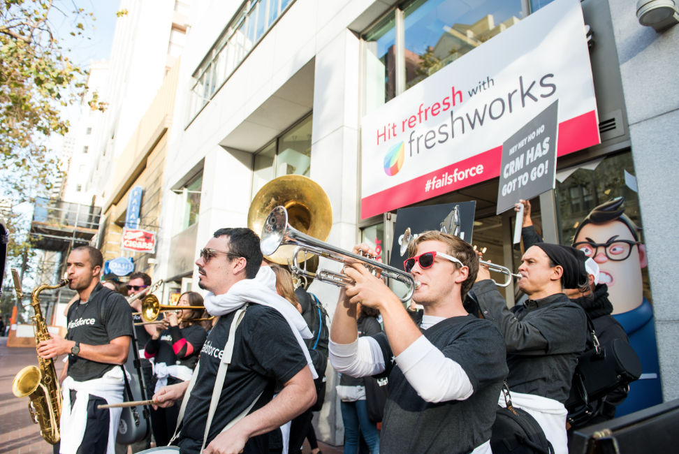 Instead of competing on features, we redefined the category. CRM software was built for management. We repositioned Freshworks as Customer-for-Life software — built for the humans actually using it. Then we picked a public fight to make the point unmissable: we flew a #failsforce blimp around Salesforce Tower during their 200,000-person Dreamforce conference.